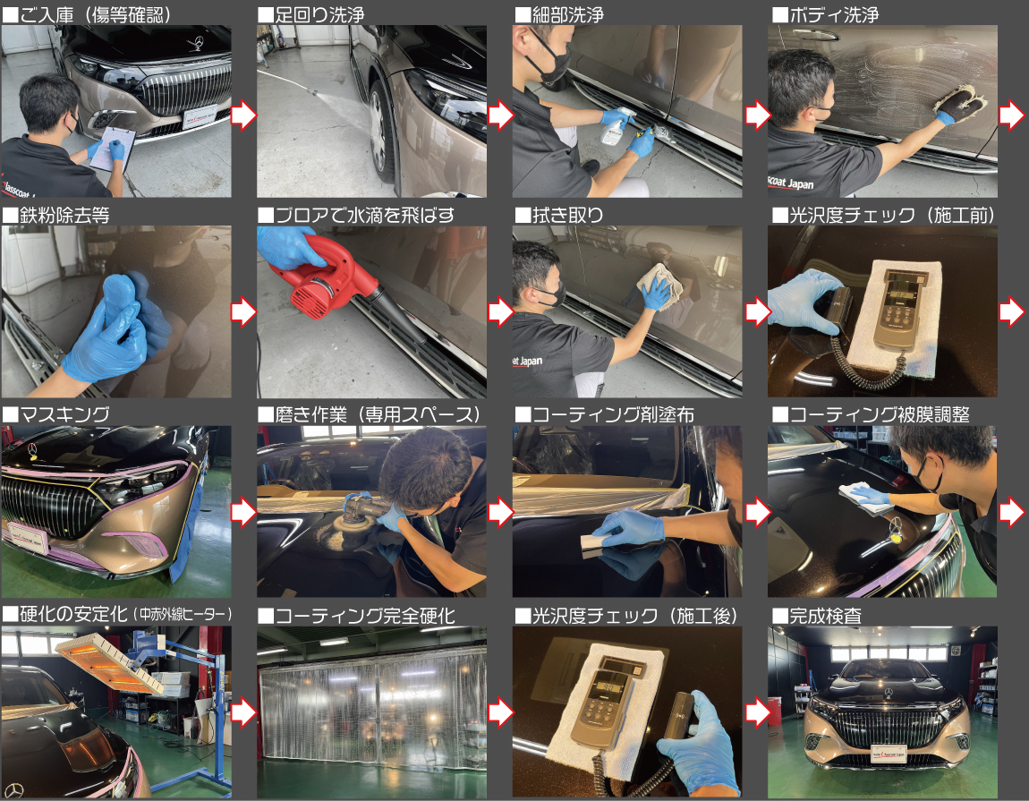 ガラスコーティング剤の中でも膜厚があるのが特長で抜群な撥水力を発揮し、陶器の様な自然な艶を生み出します。